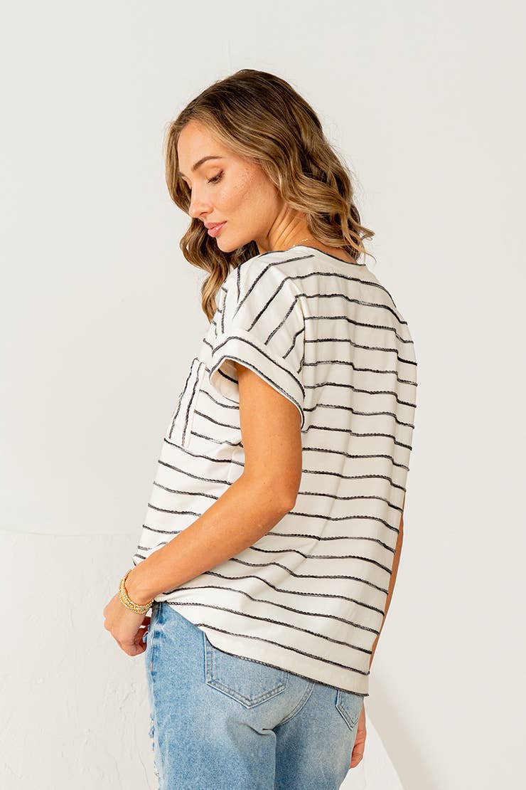 Meet your new everyday favourite. This casual striped top blends laid-back comfort with an easy kind of chic, making it a piece you’ll reach for again and again. Designed with a relaxed silhouette, cuffed short sleeves, and a front patch pocket for that hint of charm, it’s the kind of top that feels just as good as it looks.