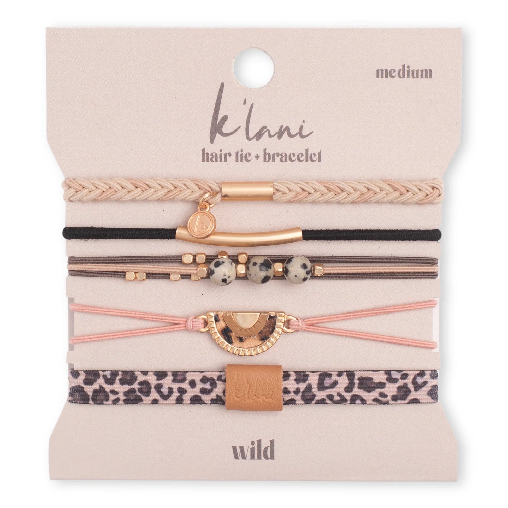 The Wild Hair Tie Bracelet Set features five versatile bands in a mix of animal prints and neutral tones that add a touch of untamed elegance to your look. This versatile accessory is perfect for keeping your hair in check while making a bold style statement on your wrist. Each band is accented with a matte gold charm — a subtle reminder to embrace your wild side with confidence and style.